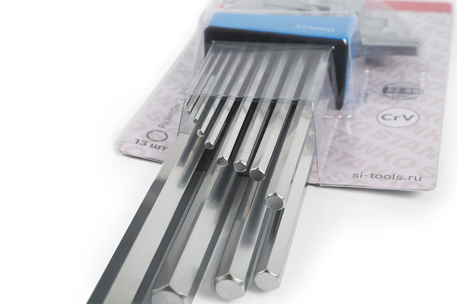 Набор угловых шестигранных ключей, состоит из 13 L-образных ключей, имеющих профиль HEX.