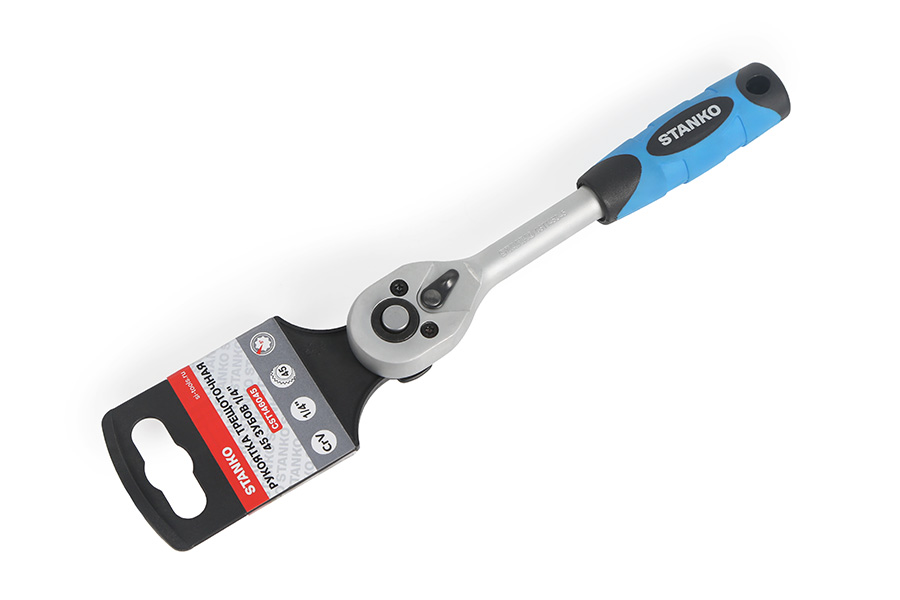 Трещотка изготовлена из высококачественной легированной хромованадиевой инструментальной стали, с последующей закалкой до твердости в пределах 46-48HRC, что обеспечивает оптимальное соотношение прочности и твердости. Эргономичная рукоять обеспечивает надежное удержание инструмента и комфортную работу, а благодаря высококачественным компонентам рукоять обладает высокой стойкостью к агрессивным средам.